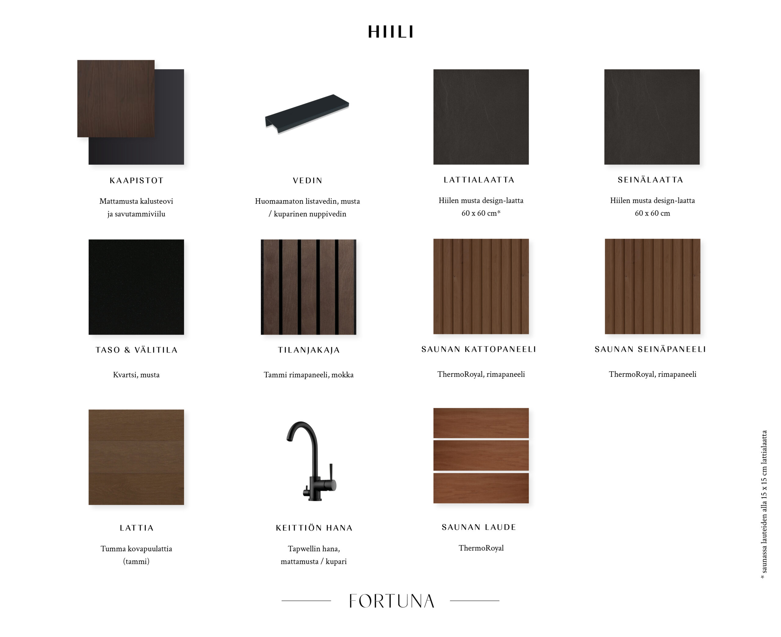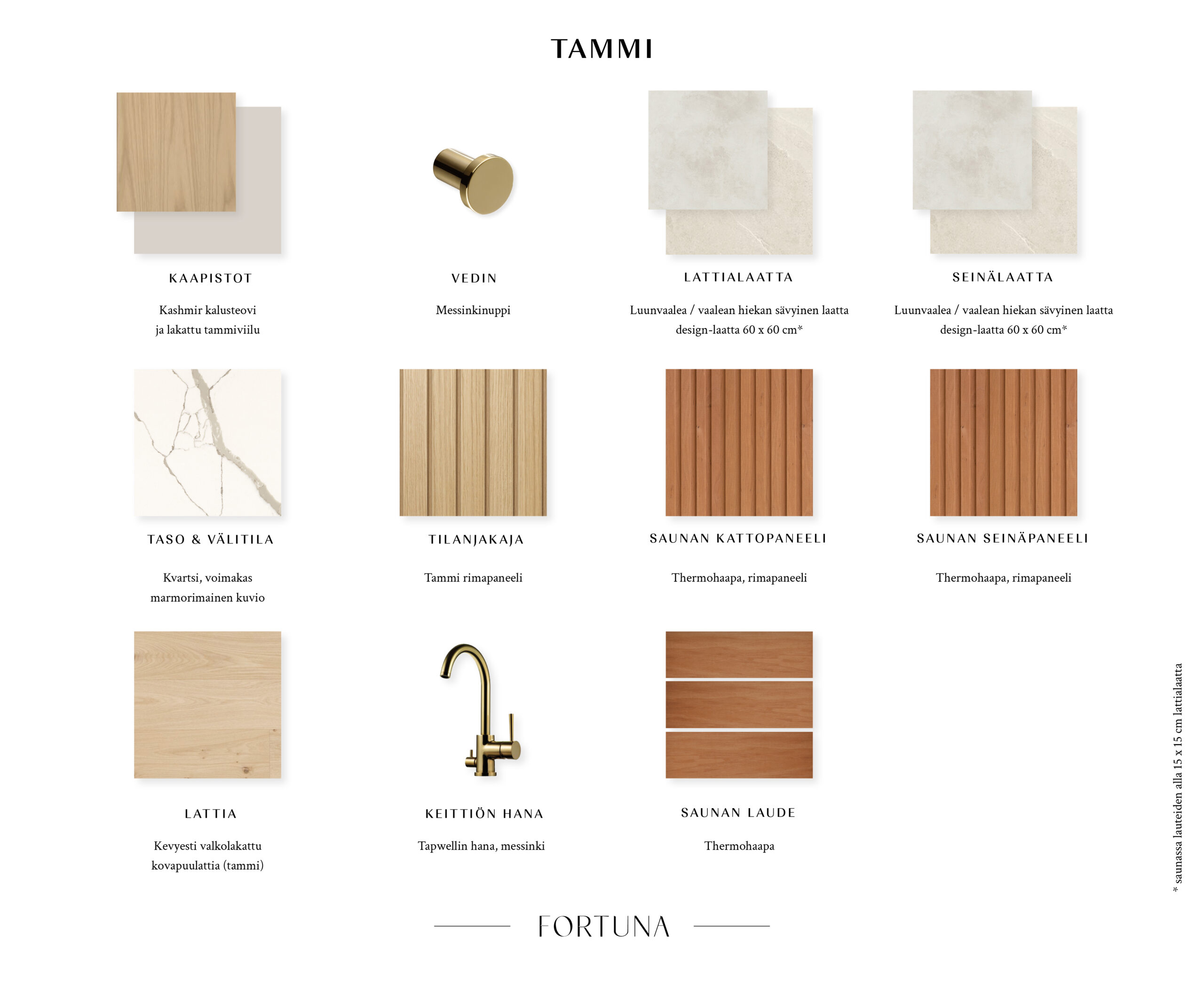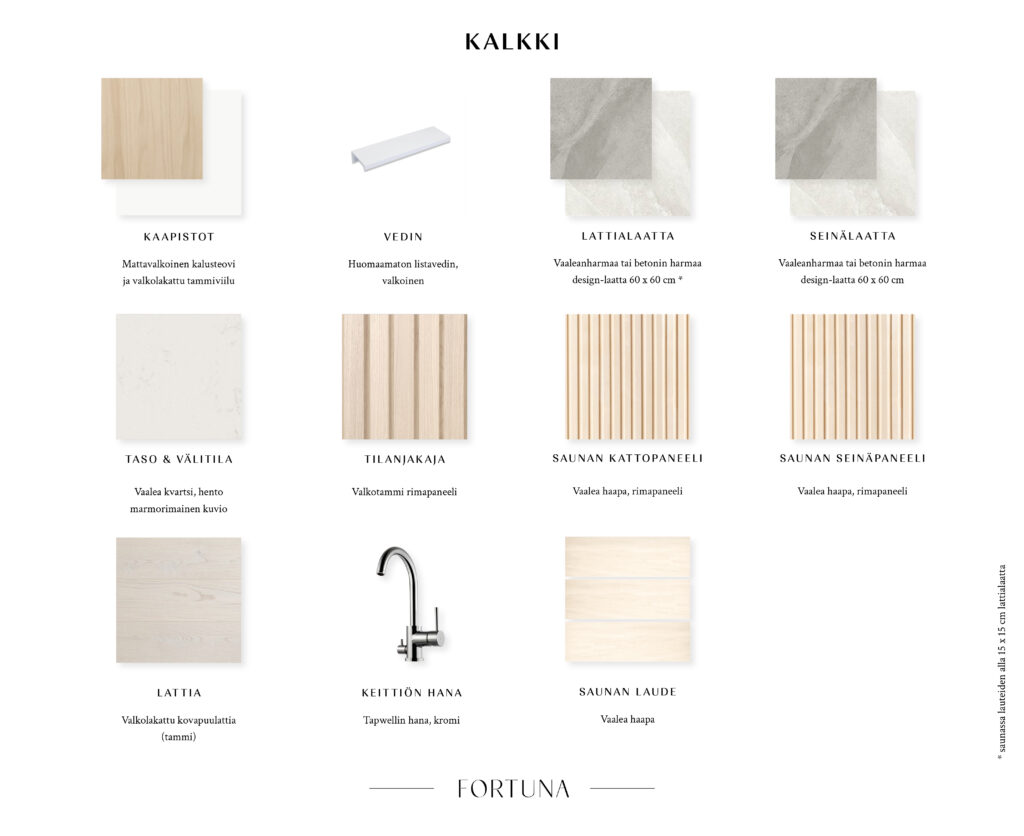 As Oy Fortunan asukkaana Sinulla on mahdollisuus vaikuttaa uuden kotisi pintamateriaaleihin. Suunnittelijamme ovat luoneet kolme skandinaavisesta sielunmaisemasta inspiroitunutta sisustusteemaa, joista voit valita mieleisesi tai yhdistellä oman maun mukaan. Vaikka kullakin teemalla on oma ainutlaatuinen luonteensa, niitä yhdistää pelkistetty tyylikkyys ja itsevarma ote.