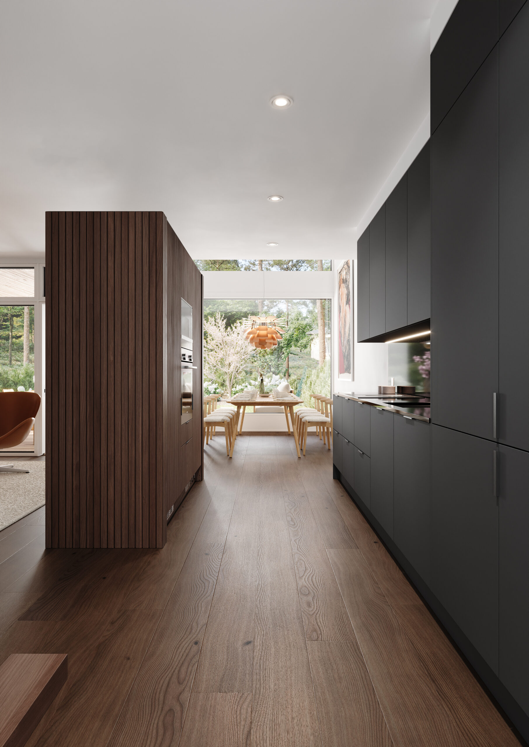 Integroitujen kodinkoneiden ja kauniin rimoituksen ansiosta keittiö on huonekalumaisen tyylikäs osa yhteisiä oleskelutiloja. Laadukkaat kodinkoneet sulautuvat saumattomasti kokonaisuuteen, tehden keittiöstä tyylikkään, käytännöllisyyttä kuitenkaan unohtamatta.