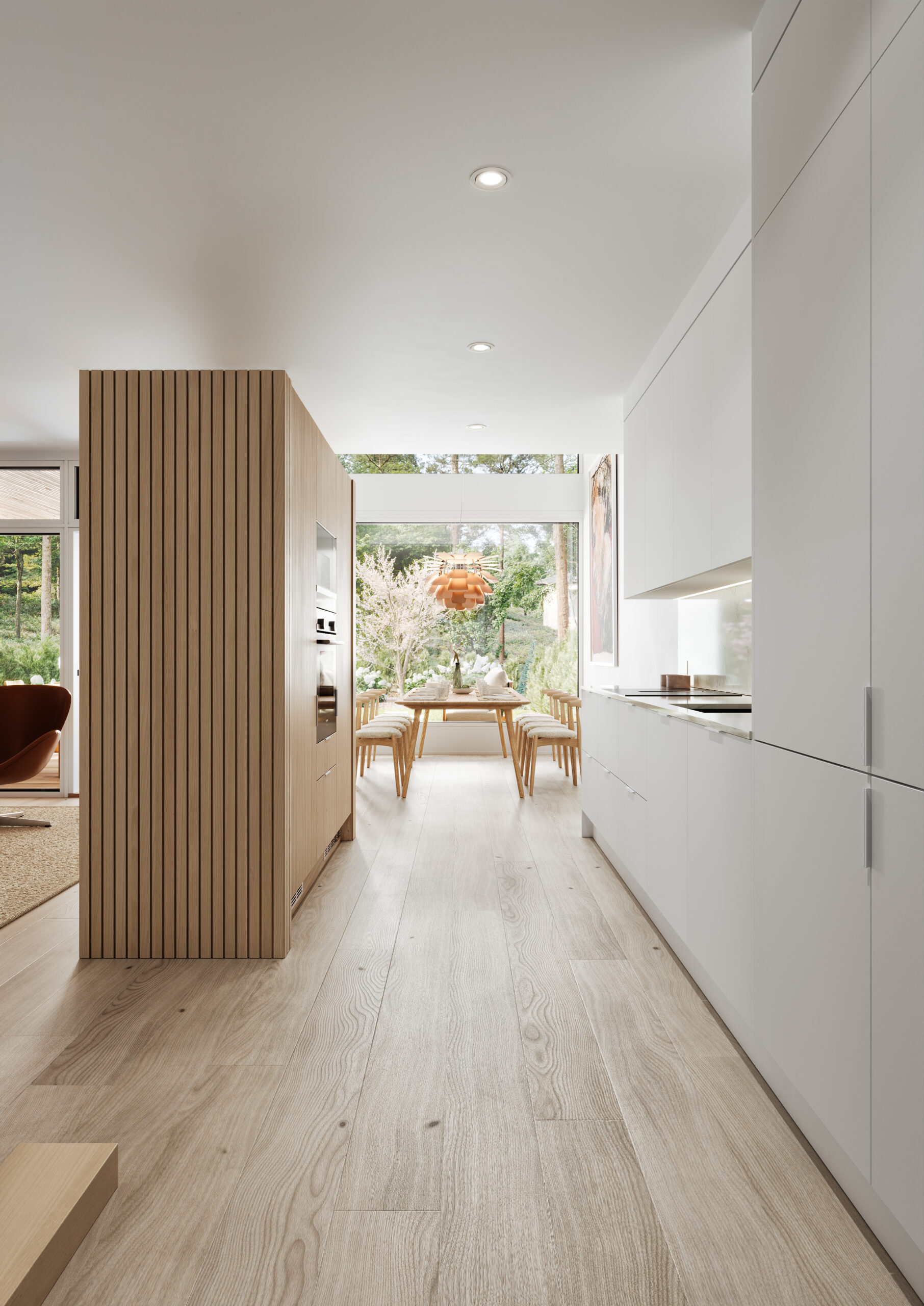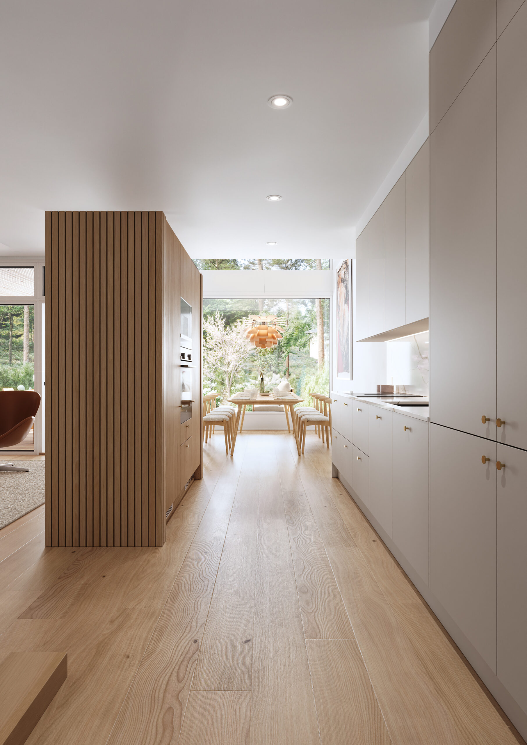 Kalkki-teeman keittiö muodostuu valkoisista kaapistoista, vaalean tammen sävyisistä rimapaneeleista sekä raikkaasta kvartsitasosta, jossa on hento marmorikuvio. Tyylikkään ja ajattoman keittiön rinnalle sopii täydellisesti vaaleaksi sävytetty lattia sekä klassinen kromi.