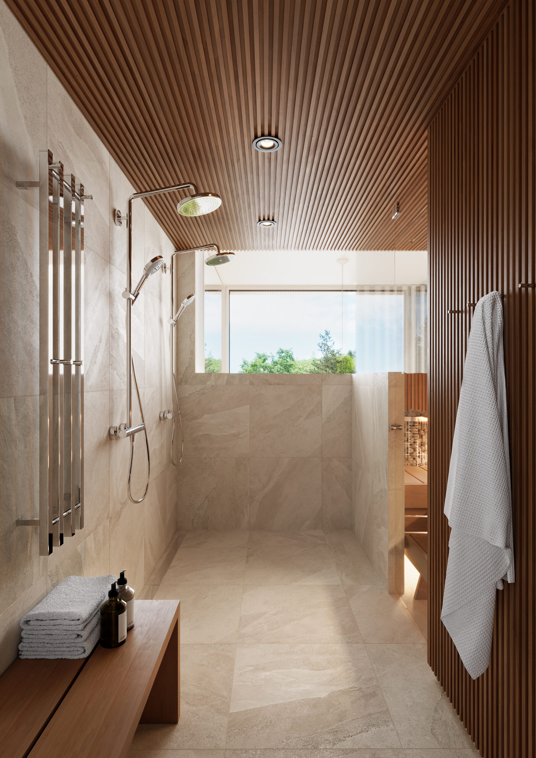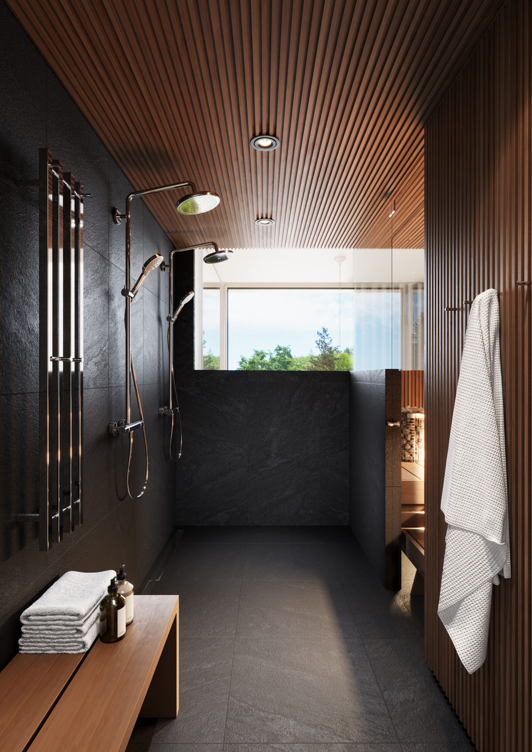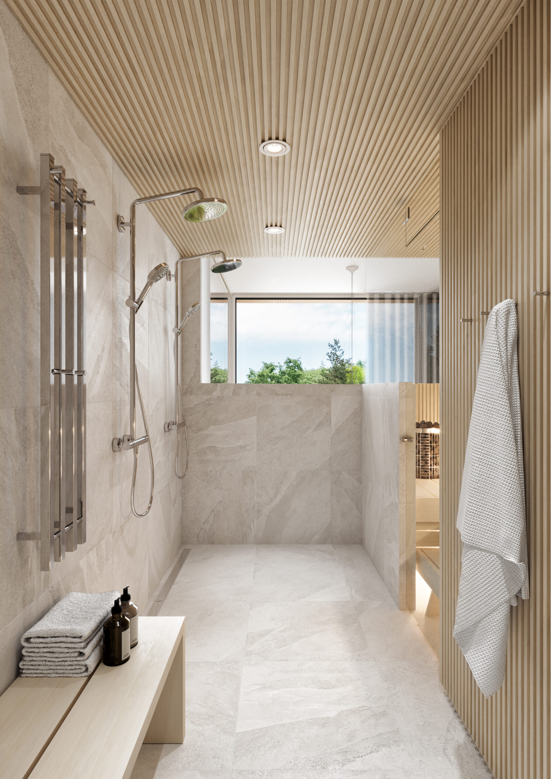 Spa-henkisen ja tunnelmallisen kotikylpylän raamit syntyvät kauniista laatoista, särmikkäistä seinäpaneeleista, integroiduista saunan lauteista sekä kylpyhuoneen puolelle tyylikkäästi jatkuvasta paneelista. Kokonaisuuden viimeistelee lauteisiin upotettava, etäohjauksella toimiva kiuas sekä epäsuora valaistus lauteiden alapinnassa ja kiukaan yllä. Kauniina arkkitehtonisena yksityiskohtana toimii kylpyhuoneen ja saunan upea panoraamasisäikkuna, joka avautuu asunnon korkeimpaan kohtaan, tarjoten näkymän aina takapihalle saakka.