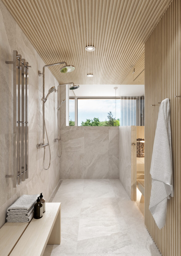 Luonnonmukainen sävymaailma toistuu myös spa-osastolla, jossa seinät ja lattia ovat hiekan sävyistä suurta design-laattaa. Tämän laatan rinnalle sopii loistavasti lämpimän sävyinen ja tunnelmallinen thermohaapa, joka toistuu sekä saunan että kylpyhuoneen tehosteseinän kauniissa rimapaneeleissa sekä katossa. Sama tyylikäs linja toistuu tietenkin aina wc-tiloissa asti.
